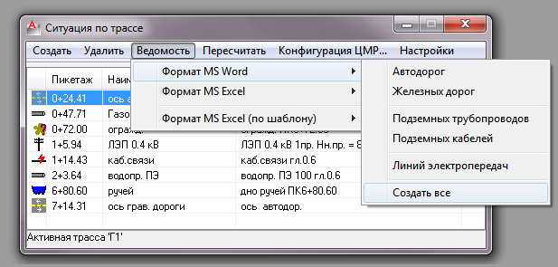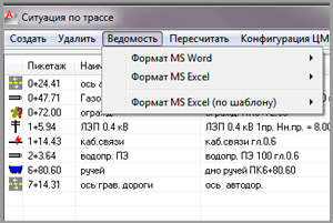 LandProf 2012 allows to generate 11 reports (lists) in MS Word, MS Excel and AutoCAD which will help to save tremendous amount of time, especially, in designs in developed areas or in cases of late stage alterations to the design. Lists are generated on the basis of edited templates. The lists include: list of turning angles, list of intersections with existing communications, list for creation of profile, list of sections with longitudinal slopes, list of hillside sections, land list, coordination/concordance list, etc.